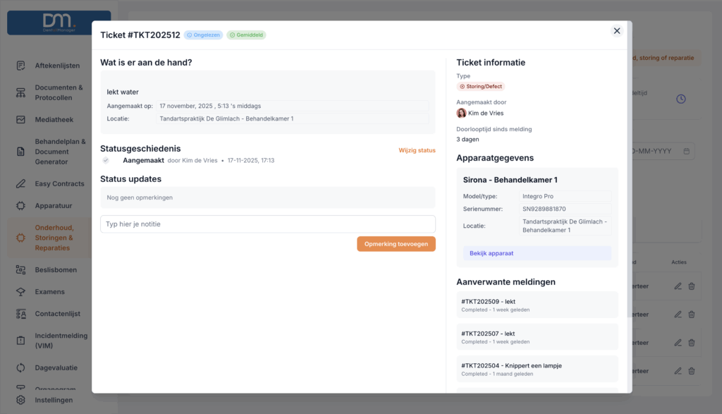 Registreer en beheer alle apparatuur in de praktijk vanuit één overzicht. Plan onderhoud, los storingen snel op en houd eenvoudig zicht op kosten en status.